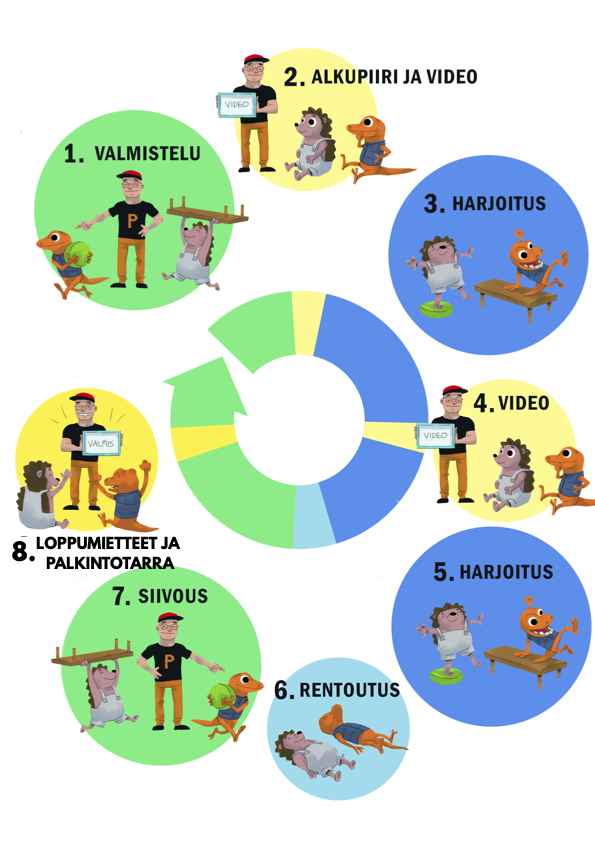 Harjoitustuokio sisältää opetusvideot harjoitteisiin. Niissä hauskat hahmot innostavat lapsia liikkumaan. Jokaisessa tehtävässä on lisäksi kirjalliset ohjeet ohjaajalle sekä itsearviointitehtävä, jonka tekemisestä saa palkinnoksi virtuaalisen tarran. Tarran voi halutessaan myös tulostaa, minkä lisäksi löytyy muutakin tulostettavaa materiaalia.